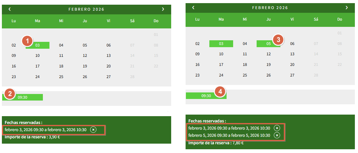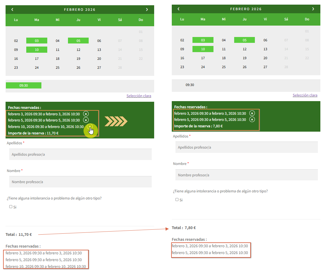 Opción 1: Eliminar haciendo clic en la cruz de cada fecha reservada. Aparecerá reflejado el nuevo coste cada vez que se borra una entrada.