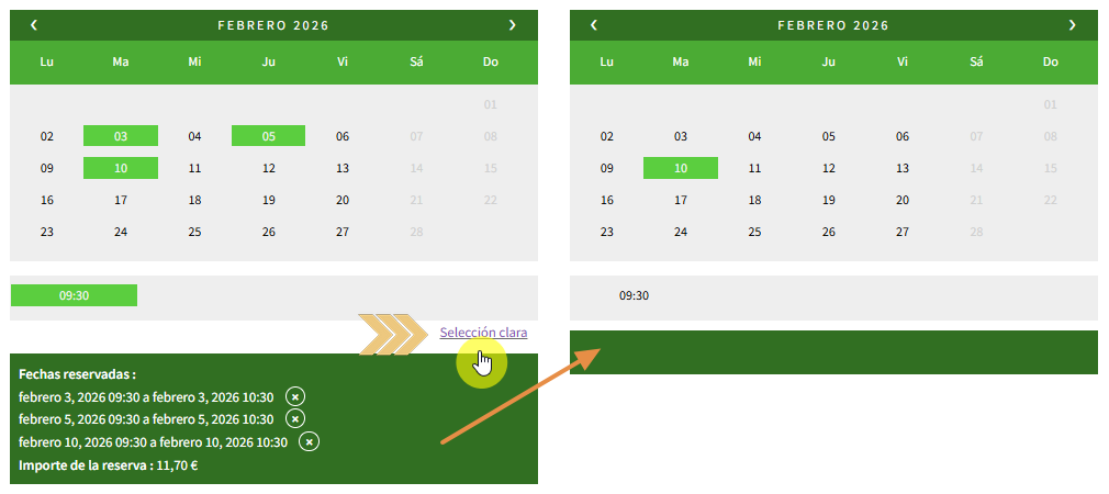Opción 2: Hacer clic en el enlace de Selección clara en la parte inferior del calendario de Fechas reservadas.